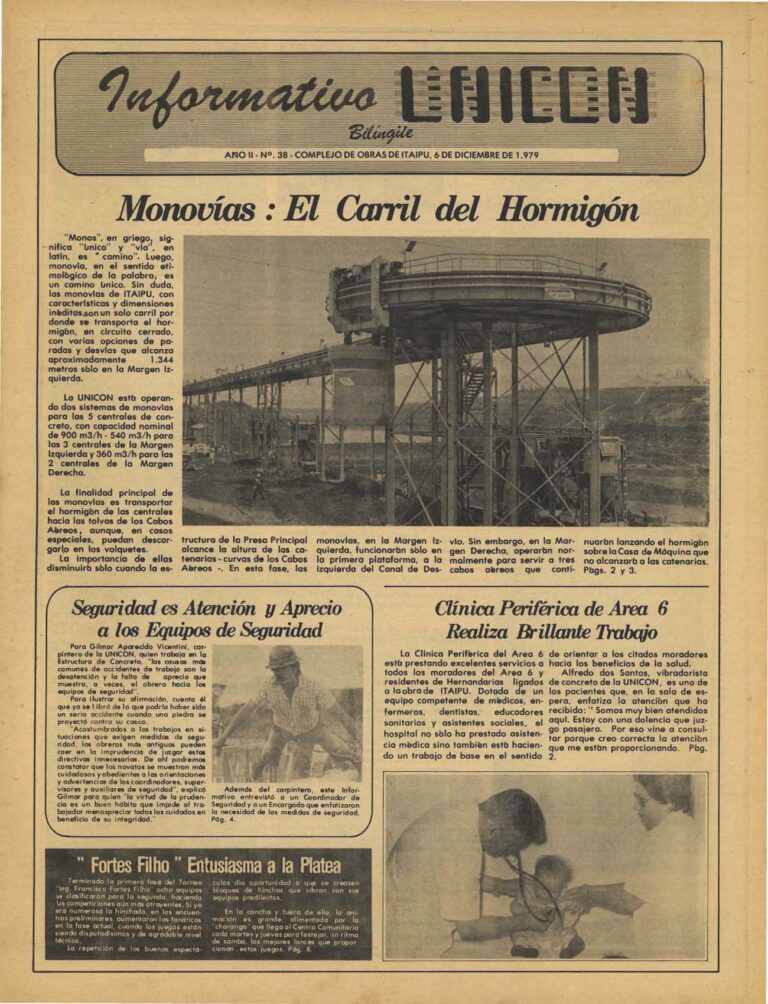 Informativo Unicon (1978-1988) O Informativo Unicon foi criado em 4 de fevereiro de 1978 e durou 10 anos, com o objetivo de informar os barrageiros brasileiros e paraguaios sobre a obra. Ele teve uma tiragem inicial de 15 mil exemplares – em seu auge, chegou a 20 mil. Tinha periodicidade quinzenal, contava com 16 páginas e era bilíngue: ao olhar de um lado, o leitor via a capa em português e oito páginas nesse idioma, mas ao fechar e virar o informativo, ele teria em mãos a capa em espanhol, com as mesmas oito páginas nessa outra língua. Para noticiar os empregados, naqueles tempos de construção, os jornalistas precisavam viajar constantemente. Logo, o jornal tinha motoristas que transportavam repórteres pelo Brasil e Paraguai e buscavam o material impresso. Entre eles estava Nelson de Marchi, que guardou todas as edições do Informativo Unicon e doou em 2014 para a Divisão de Imprensa, que digitalizou os exemplares (veja abaixo) e conservou os originais no Centro de Documentação.